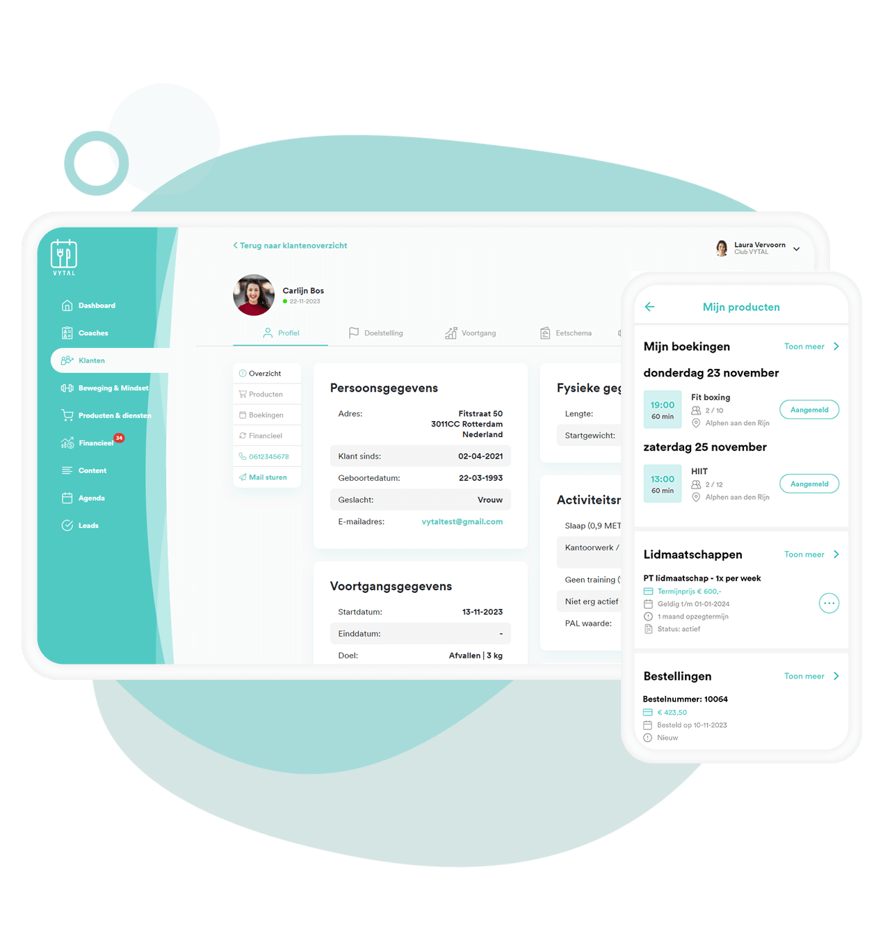 Met de VYTAL app en administratie module is het mogelijk om echt alles in één systeem te doen. Met onze gebruiksvriendelijke app voor clubs, coaches en personal trainers, is het mogelijk om direct jouw klantbeheer, administratie en facturatie te doen. Plan moeiteloos afspraken in, beheer agenda's, taken, producten, lidmaatschappen, financiële zaken, volg leads op en verstuur facturen, betaallinks en -herinneringen. Lees meer over deze module of probeer 'm gratis uit!